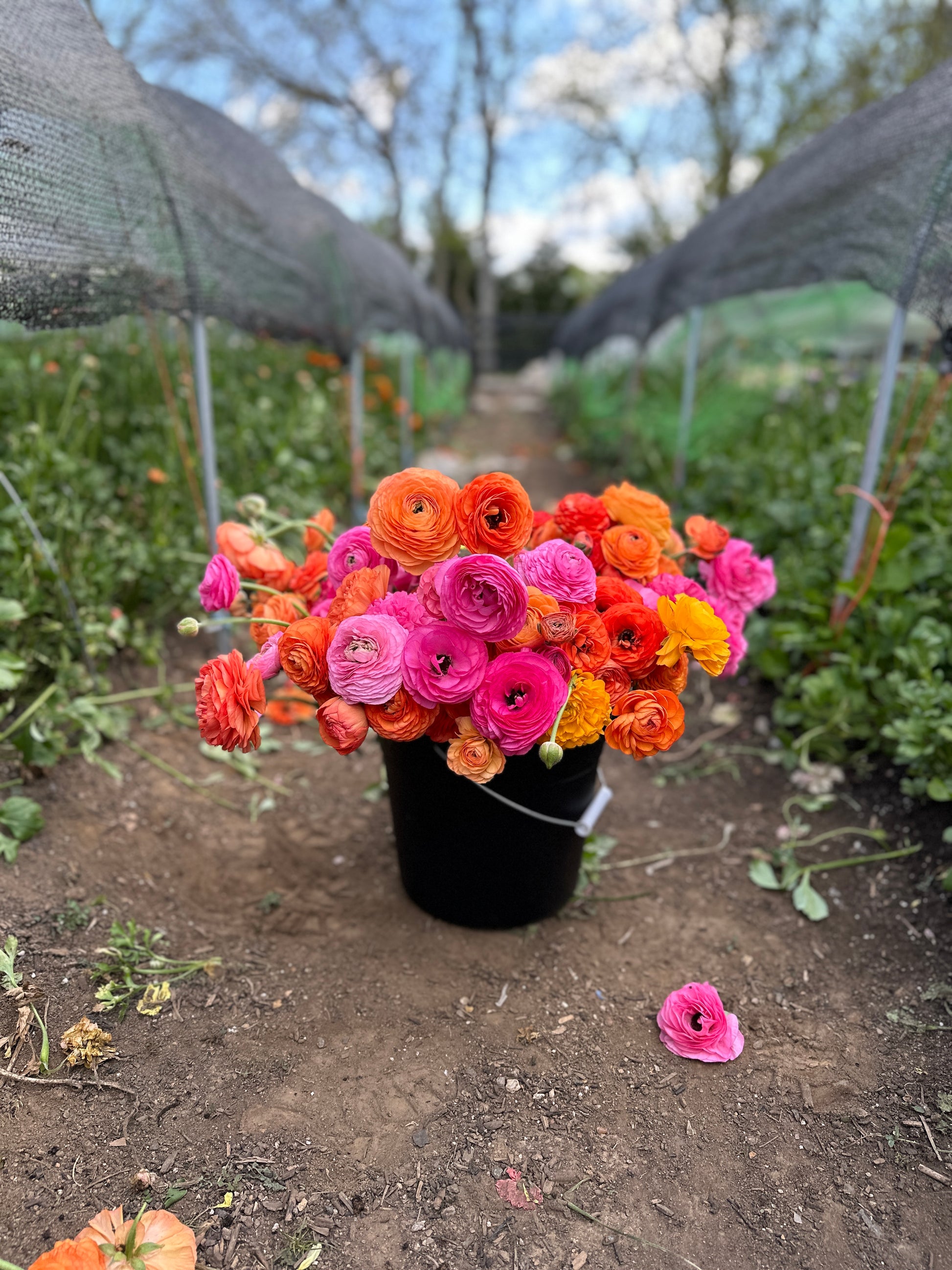 50 gorgeous ranunculus stems in a color palette of your choosing, all hydrated in a bucket and ready to design with! We grow ranunculus in every color they come in, and if we can honor a color request, we will (just drop us a note during on the checkout screen)! All ranunculus are freshly cut at the "marshmallow" stage to ensure longest vase life.